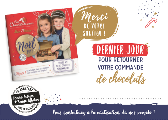 Bonjour, Merci à vous de rapporter au plus vite vos commandes de chocolats dans la boite aux lettres du club ou demain lors de la compétition. Aucune commande ne pourra être prise après le mercredi 15 novembre.