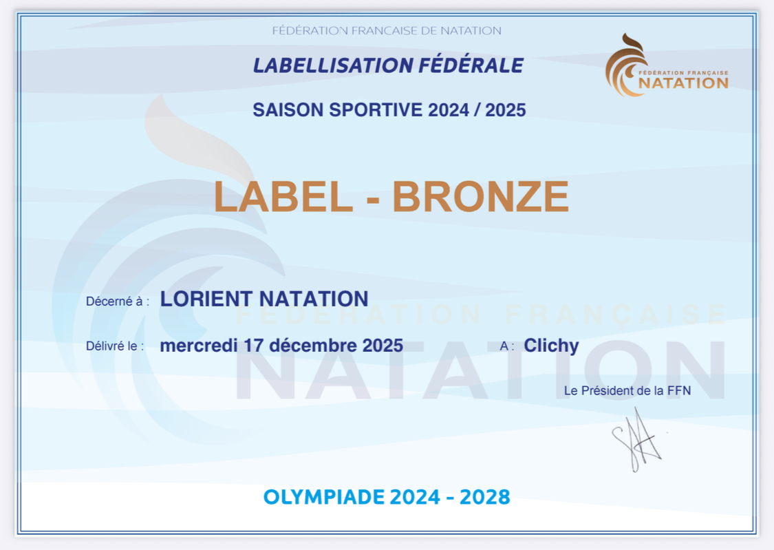 Le club LORIENT NATATION est fier de vous annoncer l’obtention du label BRONZE de la Fédération Française de Natation pour la saison 2024-2025. 🏊‍♂️
